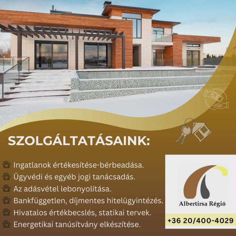 Eladásra kínálok Albertirsán a strand feletti részen egy \"mézeskalács \" házat!A telek jól megközelíthető, télen nyáron jól járható föld út, kb 300m-től aszfalt úton. A központ kb 1,5 Km távolságban elérhető. A vasút állomás 2,8 km. Az ingatlan kifejezetten csendes természetközeli részen található, itt megtapasztalhatja a tulajdonos a \"falusi életérzés\" minden pozítiv hatását! Nagyon jó szomszédok veszik körül a házat. A telek mérete alkalmassá teszi akár egy önellátő kis zöldséges kert, akár egy nagyobb pihenőkert kialakítására. Az öntözéshez fúrott kút áll rendelkezésre.Az épület egy kisebb vályog épület kibővítésével keletkezett, ( engedéllyel, tervdokumentációval!!) B30-as téglából épült a bővítés 2002-ben. A ház kifejezetten jó állapotban van, igény szerint akár azonnal költözhető. A födém betonból készült, tehát könnyen beépíthető padlástérrel rendelkezik! A nyílászárok fából készültek, hőszigetelt üvegezéssel, az ingatlan 5cm-es nikecell szigeteléssel ellátot. Az otthon melegéről gázkonvektorok gondoskodnak, a melegvizet gázbojler szolgáltatja.Minden a képek szerint!Albertirsa menetrend szerű vonatközlekedéssel rendelkezik, mely Budapest Nyugati pályaudvartól 48 perces menetidővel közelíthető meg, Budapesttől 50 km távolságra Ferihegy repülőtértõl az új M4 autópályán 35 km távolságra helyezkedik el.Kérem hívjon bizalommal, hétvégén is állok ügyfeleink rendelkezésére!Sarka László 20/4004029