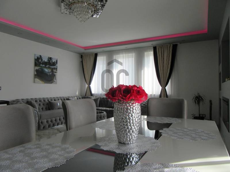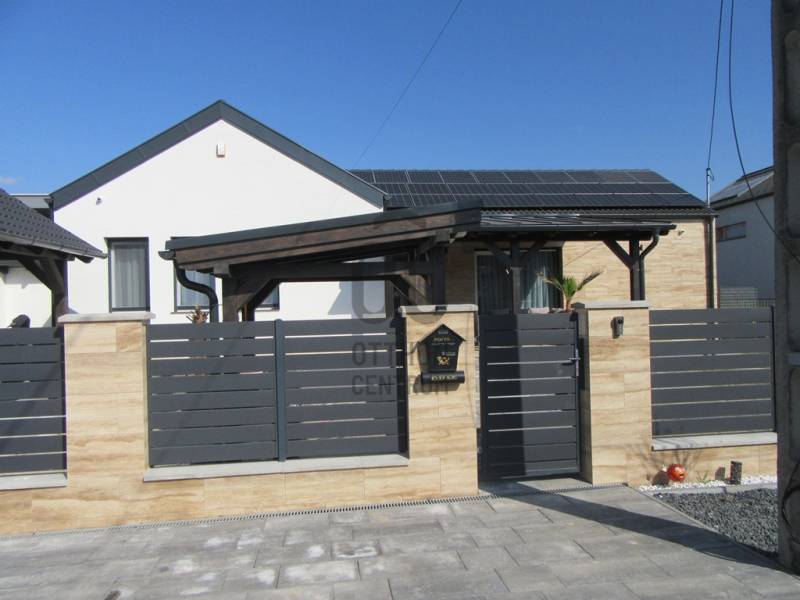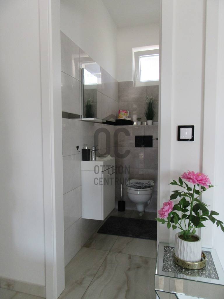 Eladó egy 2025-ben épült, exkluzív kivitelezésű ikerház egyik lakóegysége, ahol a két házrészt egy külön tároló választja el egymástól, biztosítva a zavartalan nyugalmat és a nagyobb privát szférát.Az ingatlan modern építészeti megoldásokkal és kiemelkedő műszaki tartalommal készült. A falazat 30 cm-es Porotherm téglából épült, amelyet 15 cm-es homlokzati hőszigetelés egészít ki. Az energiahatékonyságot 10 cm lépésálló aljzatszigetelés és 20 cm födémszigetelés biztosítja. A házban háromrétegű üvegezésű nyílászárók találhatók, elektromos redőnnyel és szúnyoghálóval felszerelve.A fűtésről 8 kW-os Daikin hőszivattyúval működő korszerű padlófűtés gondoskodik, míg a kellemes hőmérsékletet a nyári hónapokban két inverteres klímaberendezés biztosítja. Az energiahatékony működést 8 kW-os napelemes rendszer és H tarifa támogatja.A belső tér kialakítása stílusos és magas minőséget képvisel: igényes burkolatok, luxus kategóriájú fürdőszoba, valamint teljesen gépesített, modern beépített konyha került kialakításra. A nappali különleges hangulatát egy beépített elektromos kandalló teszi még elegánsabbá és otthonosabbá.A biztonságot kamerarendszer és riasztó szolgálja, míg a mindennapi kényelmet elektromos kapu növeli.A nappaliból egy 26 m²-es, déli tájolású terasz nyílik, amely tökéletes helyszínt biztosít pihenéshez, családi étkezésekhez vagy baráti összejövetelekhez. Az udvarban fedett, térkövezett, kétállásos kocsibeálló található.Az ingatlan tehermentes és azonnal birtokba vehető, így új tulajdonosa akár rövid időn belül élvezheti ezt a modern, energiatakarékos otthont.Ez a ház ideális választás mindazok számára, akik minőségi kivitelezést, korszerű technológiát és elegáns, nyugodt otthoni környezetet keresnek.Az ingatlan rugalmasan nézhető, hívjon, egyeztessünk időpontot.