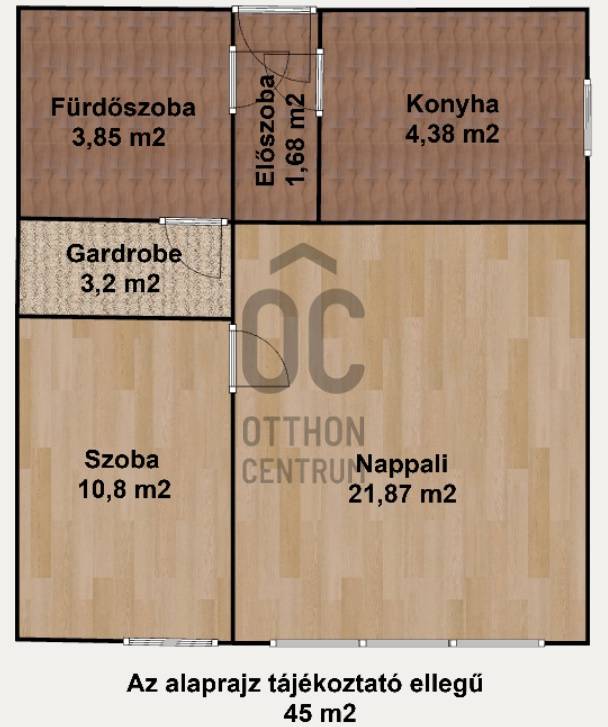 Fedezze fel Budapest 21. kerületének egyik rejtett gyöngyszemét, Szabótelepen található, 45 nm-es, két szobás lakásunkat, amely ideális választás fiatal felnőttek számára, akik egy otthonra vagy befektetési lehetőségre vágynak. Az ingatlan az Otthon Start programnak megfelel.Helyiségek:-Nappali 21,87 m2-Szoba 10,82 m2-Konyha 4,38 m2-Fürdőszoba 3,85 m2-Közlekedő 1,68 m2-Gardrobe 3,2 m2Az ingatlan jó állapotú, mivel 3 évvel ezelőtt felújításon esett át, új nyílászárók kerültek beépítésre, új biztonsági bejárati ajtót kapott, burkolatok ki lettek cserélve. A komfortérzetről a tavaly beszerelt klímaberendezés (hűtő-fűtő) gondoskodik, így a nyári melegben is kellemes hőmérséklet biztosított.A lakás elrendezése praktikus, a tágas nappali és a kényelmes hálószoba kellemes légkört biztosít. Az ablakos konyha biztosítja a szagmentes főzést.A panorámás kilátás nemcsak a lakás értékét növeli, hanem mindennapjait is szebbé varázsolja, hiszen a természet közelsége és a városi élet harmonikus összhangban áll egymással. Szabótelep csendes utcáiban sétálva felfedezheti a környék előnyeit, hiszen a közeli parkok és zöld területek ideálisak a kikapcsolódásra és a sportolásra.A környék biztonságos, ami különösen fontos lehet fiatal felnőttek számára, akik aktív életet élnek.A környék infrastruktúrája kiváló: számos élelmiszer bolt, iskola, óvoda, étterem és sok egyéb más szolgáltatás megtalálható a közelben.A környéken ingyenes a parkolás.A közlekedési lehetőségek is kiemelkedőek: az ingatlan könnyen megközelíthető autóval, és a tömegközlekedési járatok is csak pár percnyi távolságra találhatók. A közeli buszmegállók és villamosmegállók révén Budapest belvárosa gyorsan elérhető, így Ön mindig a város szívében lehet. Ez a lakás tökéletes választás lehet Önnek, ha szeretne egy olyan otthont, ahol a városi élet minden előnyét élvezheti, miközben a természet közelsége is biztosított. Bízunk benne, hogy felkeltettük érdeklődését e csodás lakás iránt. Kérjük, ne habozzon feltenni kérdéseit a hét bármely napján.Ez az ingatlan a \"Felező csomag\" megbízási portfólióhoz tartozik. Részletek az Otthon Centrum weboldalán.