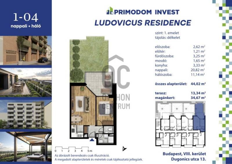 Az Orczy negyedben található új, 41,6 nm-es lakásunk ideális választás, ha Ön egy friss, energikus környezetben szeretne élni, ahol a város nyüzsgése és a természet közelsége egyaránt megtalálható.Újépítésű lakásról lévén szó vételi szándék esetén előszerződés köttetik az építtetővel. A tervezett átadás 2026 nyara.Műszaki tartalom:Az épület monolit vasbeton lemezalapra épül. Az épület hagyományos építési módban kerül kivitelezésre, monolit vasbeton vázszerkezettel, statikailag méretezett monolit vasbeton födémekkel, merevítő falakkal és pillérekkel.A külső térelhatároló fallak pórusbeton vázkitöltő falazatok. Mind a téglafalazatok, mind a vasbeton falak az előírt hőtechnikai méretezésnek megfelelő vastagságú hőszigetelő rendszerrel készülnek. A lakásokon belüli válaszfalak 2x2 rétegű gipszkarton szerkezetből készülnek.A födémeken a lépés-hanggátlás biztosítására akusztikailag minősített szigetelésen úsztatott aljzatbeton készül, mely egyben a burkolatok fogadó szerkezete is.Az épület lapostetős kialakítású zöldtetővel.Az épületben fehér színű műanyag profilrendszerű szerkezetek kerülnek elhelyezésre korszerű, többrétegű hőszigetelő üvegezéssel, jó légzárással. A műanyag homlokzati nyílászárók vagy komplett redőnnyel kerülnek beépítésre, vagy redőny nélkül.Az épület homlokzata ragasztott klinker burkolat vagy vakolt felület.Az épületben 1 db 13 személyes 1000 kg korszerű hívólift kerül beépítésre. Az épületben egy modern megjelenésű, lamellázással részben védett, nyitott homlokzatú lépcsőház kerül kialakításra.A teremgarázs bejáratánál távirányítással működtethető garázskapu kerül elhelyezésre.Az épület földszintjén egyszintes teremgarázs kerül kialakításra. A gépkocsibeállókhoz elektromos töltő kiépítésének lehetősége biztosított.Az épület teljesíti a 7/2006. TNM rendelet közel nulla energiaigényű épületekre vonatkozó követelményeit. A fűtési energia és melegvíz előállítására szolgáló energia korszerű hőszivattyúkkal központilag kerül előállításra. A lakások fűtése a folyamatos tartózkodásra szolgáló helyiségekben padlófűtéssel valósul meg. A hőszivattyús rendszer lehetővé teszi a lakások hűtését is oldalfali fan-coil berendezések segítségével.A kaputelefon rendszer digitális, ajtónyitó funkcióval ellátott.A lakás belső kialakítását, úgymint burkolatok, kádak, zuhanyok, szaniterek, csaptelepek, belső ajtók vásárlóink különböző, belsőépítészek által összehangolt anyagválasztékú és színvilágú berendezési csoportokból választhatja ki a vevő, amely a megtekintés során kerül ismertetésre. A képek között szerepel az értékesítési iroda bemutatóterem része is, ahol az érdeklődők szemrevételezni tudják a választékot.A lakás konyhabútor, valamint konyhagépek nélkül kerül átadásra.A hideg- és használati melegvíz, valamint a fűtés-hűtés energia fogyasztása lakásonként önállóan mérhető. A lakás 1x32A elektromos kapacitással rendelkezik.A lakás az első emeleten található és közvetlen kertkapcsolattal rendelkezik, amelyre a 13,34 négyzetméteres teraszon keresztül jutunk ki. A kert 39,38 négyzetméter. A lakás tájolása délkeleti, így kiváló fényviszonyokkal rendelkezik.Ez a lakás kiváló választás egyetemistáknak, fiatal házaspárnak, vagy akár egyedülállóak számára is.Az épület a Ludovika Huszárlovarda szomszédságában található. A Dugonics utca a VIII. kerület egyik csendesebb mellékutcája az Orczy-negyedben, amely az elmúlt években folyamatos rehabilitáción megy keresztül. A környéken egyre több fejlesztés indul, amely tovább növeli a városrész vonzerejét a lakók és a befektetők számára. A közelben található az Orczy-kert, az ELTE Füvészkert, valamint több egyetem és jó tömegközlekedési kapcsolat, ami különösen vonzóvá teszi a területet bérbeadási és befektetési szempontból.