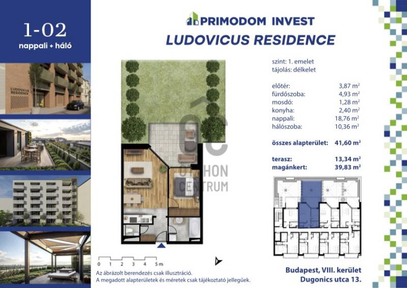 Az Orczy negyedben található új, 41.6 nm-es lakásunk ideális választás, ha Ön egy friss, energikus környezetben szeretne élni, ahol a város nyüzsgése és a természet közelsége egyaránt megtalálható.Újépítésű lakásról lévén szó vételi szándék esetén előszerződés köttetik az építtetővel. A tervezett átadás 2026 nyara.Műszaki tartalom:Az épület monolit vasbeton lemezalapra épül. Az épület hagyományos építési módban kerül kivitelezésre, monolit vasbeton vázszerkezettel, statikailag méretezett monolit vasbeton födémekkel, merevítő falakkal és pillérekkel.A külső térelhatároló fallak pórusbeton vázkitöltő falazatok. Mind a téglafalazatok, mind a vasbeton falak az előírt hőtechnikai méretezésnek megfelelő vastagságú hőszigetelő rendszerrel készülnek. A lakásokon belüli válaszfalak 2x2 rétegű gipszkarton szerkezetből készülnek.A födémeken a lépés-hanggátlás biztosítására akusztikailag minősített szigetelésen úsztatott aljzatbeton készül, mely egyben a burkolatok fogadó szerkezete is.Az épület lapostetős kialakítású zöldtetővel.Az épületben fehér színű műanyag profilrendszerű szerkezetek kerülnek elhelyezésre korszerű, többrétegű hőszigetelő üvegezéssel, jó légzárással. A műanyag homlokzati nyílászárók vagy komplett redőnnyel kerülnek beépítésre, vagy redőny nélkül.Az épület homlokzata ragasztott klinker burkolat vagy vakolt felület.Az épületben 1 db 13 személyes 1000 kg korszerű hívólift kerül beépítésre. Az épületben egy modern megjelenésű, lamellázással részben védett, nyitott homlokzatú lépcsőház kerül kialakításra.A teremgarázs bejáratánál távirányítással működtethető garázskapu kerül elhelyezésre.Az épület földszintjén egyszintes teremgarázs kerül kialakításra. A gépkocsibeállókhoz elektromos töltő kiépítésének lehetősége biztosított.Az épület teljesíti a 7/2006. TNM rendelet közel nulla energiaigényű épületekre vonatkozó követelményeit. A fűtési energia és melegvíz előállítására szolgáló energia korszerű hőszivattyúkkal központilag kerül előállításra. A lakások fűtése a folyamatos tartózkodásra szolgáló helyiségekben padlófűtéssel valósul meg. A hőszivattyús rendszer lehetővé teszi a lakások hűtését is oldalfali fan-coil berendezések segítségével.A kaputelefon rendszer digitális, ajtónyitó funkcióval ellátott.A lakás belső kialakítását, úgymint burkolatok, kádak, zuhanyok, szaniterek, csaptelepek, belső ajtók vásárlóink különböző, belsőépítészek által összehangolt anyagválasztékú és színvilágú berendezési csoportokból választhatja ki a vevő, amely a megtekintés során kerül ismertetésre. A képek között szerepel az értékesítési iroda bemutatóterem része is, ahol az érdeklődők szemrevételezni tudják a választékot.A lakás konyhabútor, valamint konyhagépek nélkül kerül átadásra.A hideg- és használati melegvíz, valamint a fűtés-hűtés energia fogyasztása lakásonként önállóan mérhető. A lakás 1x32A elektromos kapacitással rendelkezik.A lakás az első emeleten található és közvetlen kertkapcsolattal rendelkezik, amelyre a 13,34 négyzetméteres teraszon keresztül jutunk ki. A kert 39,83 négyzetméter. A lakás tájolása délkeleti, így kiváló fényviszonyokkal rendelkezik.Ez a lakás kiváló választás egyetemistáknak, fiatal házaspárnak, vagy akár egyedülállóak számára is.Az épület a Ludovika Huszárlovarda szomszédságában található. A Dugonics utca a VIII. kerület egyik csendesebb mellékutcája az Orczy-negyedben, amely az elmúlt években folyamatos rehabilitáción megy keresztül. A környéken egyre több fejlesztés indul, amely tovább növeli a városrész vonzerejét a lakók és a befektetők számára. A közelben található az Orczy-kert, az ELTE Füvészkert, valamint több egyetem és jó tömegközlekedési kapcsolat, ami különösen vonzóvá teszi a területet bérbeadási és befektetési szempontból.