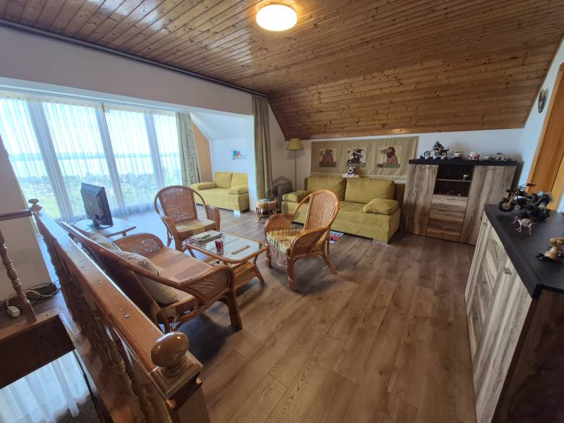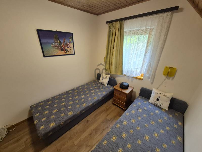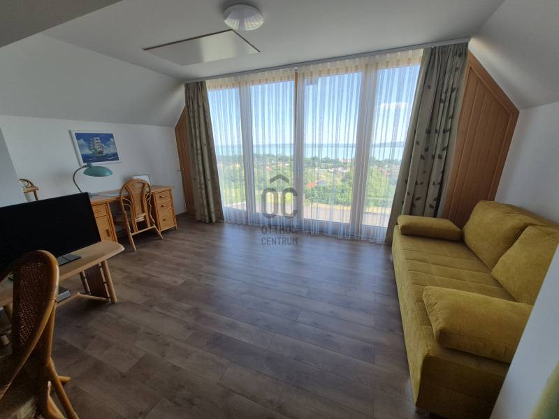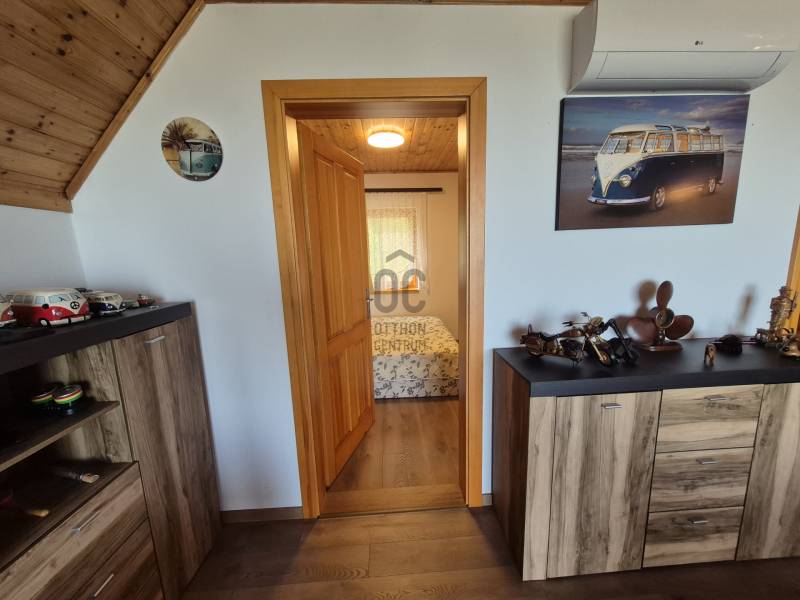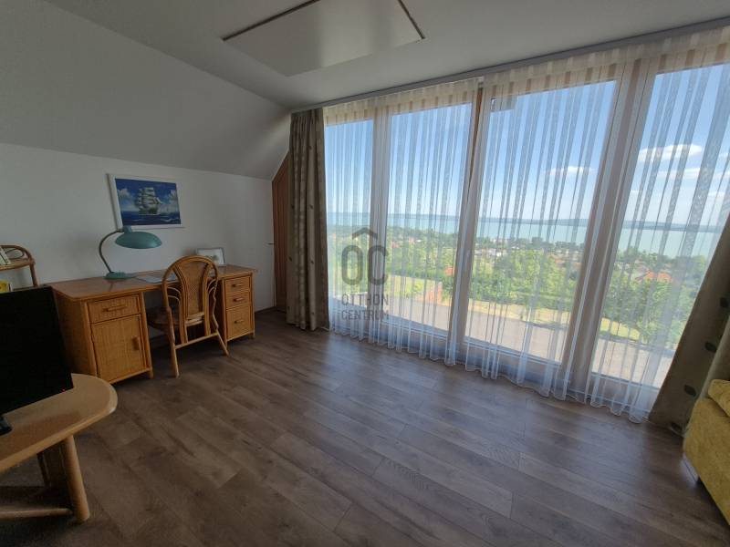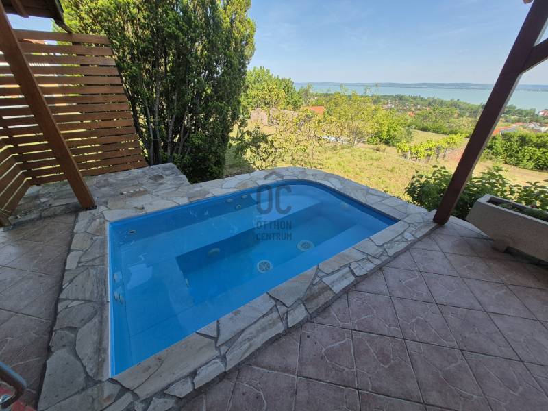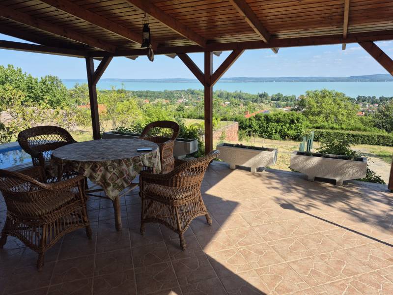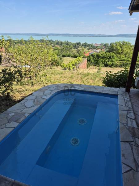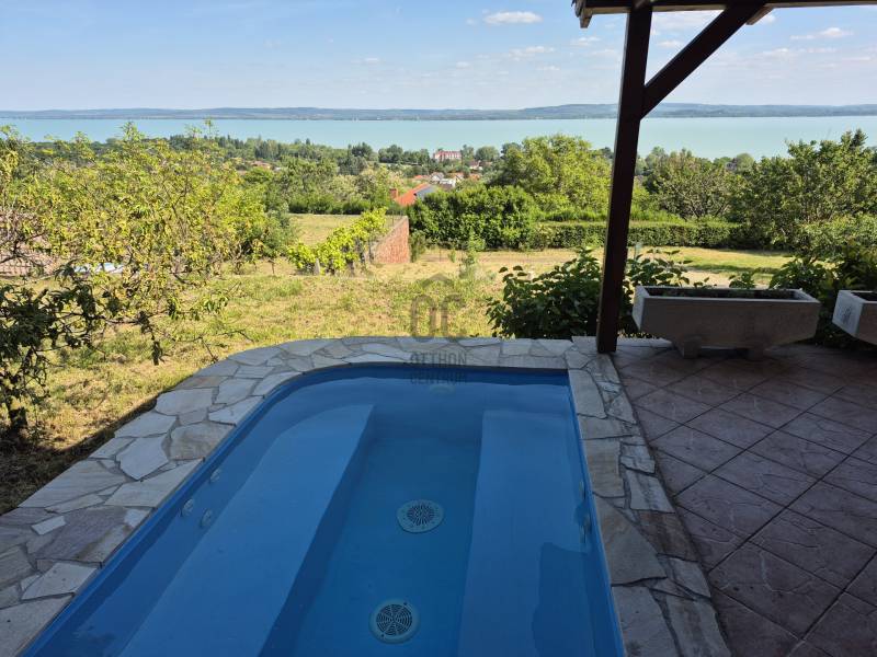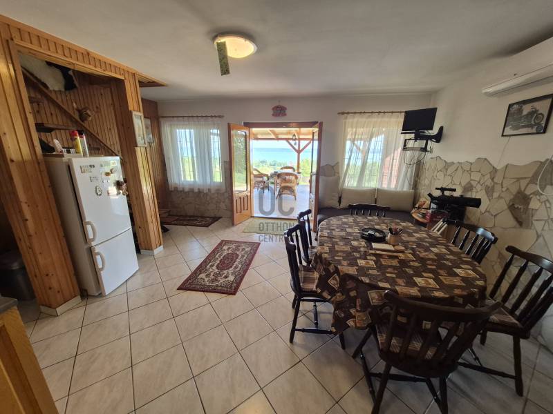 Révfülöpön ajánlom figyelmébe ezt a kifogástalan állapotú, 3 szobás nyaralót, mely a hozzá kapcsolódó 1418 nm-es telekterületével nyugodt pihenést biztosít az év minden időszakában.Az alsó szinten egy étkező-konyha-nappali fogad minket, mely közvetlenül kapcsolódik a 40nm-es teraszhoz, melynek minden pontjáról csodálatos panorámában gyönyörködhetünk.Innen nyílik még egy vendég mosdó, valamint egy kis közlekedő is, ahonnan a fürdőszobát és a kamrát közelíthetjük meg.A terasz része egy épített jakuzzi, innen egy nyáron napon is kényelmesen élvezhetjük a pazar kilátást.Ezenkívül sütögető, kültéri zuhany, kerti tároló, fúrt kút és fedett kocsibeálló is rendelkezésre áll!Az emeleten egy nagy, 35 nm-es nappaliból élvezhetjük a Tihanytól Fonyódig tartó balatoni panorámát egy hatalmas hővédő üvegfelületen keresztül, és emellett két hálószoba is található még ezen a szinten.A téglából épült nyaraló víz, villany közművekkel rendelkezik, a szennyvíz elvezetése emésztővel megoldott. A meleg vizet villany bojler adja.Fűtését cserépkályha biztosítja, az emeleten hűtő-fűtő klíma is rendelkezésre áll. Egész évben könnyen megközelíthető helyen, zsákutca végén található, melyhez magánút vezet, közeli szomszédok nincsenek, így a nyugodt pihenés garantált.A házhoz tartozó terület parkosított és szépen karbantartott, egyszerre több autó parkolása is megoldható.A helyi bolt, étterem és a révfülöpi strand is egy kényelmes sétával elérhető!Ha balatoni panorámás nyaralót keres, ezt mindenképp látnia kell!