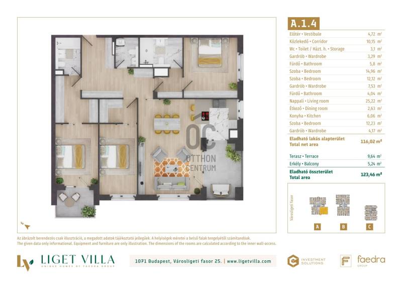 Projekt bemutatásaAki többre vágyik, mint egy átlagos lakópark, most hazaérkezett! Itt élni, itt lakástulajdonosnak lenni, egyet jelent a minőséggel.Az épületrőlA pesti diplomatanegyed legszebb utcájában épül, a megjelenésében, műszaki tartalmában és a lakáskínálata tekintetében egyaránt unikális, Liget Villa Lakópark. Az épületbe érve, egy elegáns lobby és recepcióra érkezünk majd. Innen a három épületet egy kerti úton, passzázs köti majd össze. A tervezés során nagy hangsúlyt kapott a családi igényekre tervezett lakás minőségi használhatósága. Ablakos konyhák, master bedroom-ok, dupla fürdőszobák, gardrób és háztartási helyiségek is helyet kapnak a lakásban. Kiemelten jól bútorzható, két irányba tájolt lakások kerülnek kialakításra. A földszinti lakásokhoz 50-100 m2-es privát kertek, míg a közös területeken tájépítész által tervezett reprezentatív kertet alakítunk ki. A lakásokban mennyezeti hűtés-fűtés biztosítja a téli-nyári kellemes komfortérzetet. A nyílászárók 3 rétegű üveggel, alu-fa kivitelben kerülnek beépítésre. A lakások ára tartalmazza alapárban az alu elektromos redőnyöket és okosotthon kiépítést is. Magas minőségű olasz és spanyol hidegburkolatválasztékban akár 60x60 cm-es lapok is válaszhatóak majd. A fa parketta és az átlag feletti minőség szaniterek, szintén alapárban válaszhatóak a lakásokba. Az épületek alatti mélygarázsban gépkocsibeállók és tárolók kerülnek kialakításra. A környékről:A környék közlekedése kiváló. 5 perc sétával elérhető a Andrássy úton a kisföldalatti. A szomszédos Balzac utcában és Dózsa György úton is számos buszjárat és troli is közlekedik. A város számos pontjára, akár átszállás nélkül is eljuthatunk. Ha pedig autóval közlekedünk, az M3 autópálya pár perc alatt elérhető. A Városligeti fasor két oldalán található szervízúton, parkolnia is lehet a Liget Villa Lakóparkba érkezőknek.Előnyök:A Liget Villa Lakpark lakásai, tökéletes választás azoknak, akik szeretnék élvezni a városi kényelmet anélkül, hogy lemondanának a természet közelségéről és a csendes életformáról. A belváros és a zöld liget is sétatávolságban elérhető. A gyerekek számára paradicsom a Városliget. Játszóterek, tó, sportpályák, állatkert, minden, amit egy gyerek csak kívánhat egy parkban. A közelben pedig a kultúrát és a sportos életformát kedvelők, egyaránt megtalálják a számukra fontos helyszíneket. Néprajzi, Szépművészeti, Mezőgazdasági múzeumok, a Magyar Zene Háza, a Műcsarnok mind-mind gazdag élményt nyújtanak az oda látogatóknak. A Városliget fasor pedig már önmagában egy oázis a városi környezetben. Hatalmas gesztenyefák, gyönyörű villaépületek, követségek, gimnázium, templom mellett sétálhatunk el nap mint nap. Ide nagyon jó lesz minden nap hazajönni.