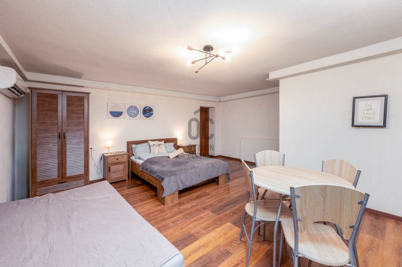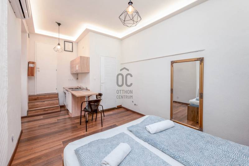 Eladó egy különleges kialakítású, 49 m²-es lakás, amely jelenleg két különálló lakrészként funkcionál. A lakás két szobával és két fürdőszobával rendelkezik, így ideális megoldás lehet diákoknak, testvéreknek vagy barátoknak, akik szeretnének együtt lakni, mégis megőrizni a saját privát terüket.A lakás különlegessége, hogy egyben van, mégis két jól elkülönülő élettérből áll, így befektetési szempontból is rendkívül praktikus. Hosszútávú kiadásra kiváló, hiszen a környék rendkívül népszerű a külföldi és magyar egyetemisták körében is.Az ingatlanhoz tartozik egy 16 m²-es \"terasz\", amely a félemeleten található, és kellemes plusz életteret biztosít. Az egyik lakrész 240 cm, a másik 300 cm belmagasságú, ami változatos térérzetet ad a lakásnak. A nyugati fekvésű udvari nézet csendes és nyugodt környezetet biztosít a belváros szívében.A komfortérzetről fűtő-hűtő klíma gondoskodik minden évszakban. Az ingatlanban nincs gázvezeték, a közös költség mindössze 19.000 Ft, amely a vízfogyasztást is tartalmazza.A lakás teljes bútorzattal és berendezéssel együtt eladó, így akár azonnal költözhető vagy kiadható.A környék páratlan: a Liszt Ferenc tér tele van hangulatos éttermekkel, kávézókkal és kulturális programokkal. Néhány perc sétára található az Oktogon, a Zeneakadémia, valamint számos egyetem és szórakozási lehetőség.Az ingatlan ritkaságnak számít ezen a környéken, különleges kialakítása miatt pedig valódi kuriózum a belvárosi lakások között.Ha felkeltette érdeklődését ez a remek lehetőség, keressen bizalommal, és egyeztessünk időpontot a megtekintésre!