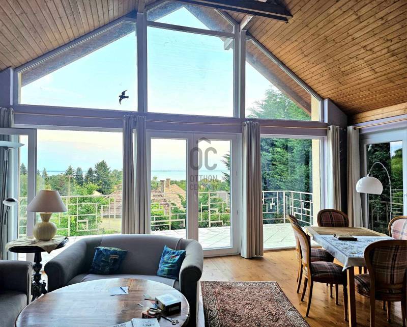 Badacsonyban vált eladóvá ez a különleges atmoszférával rendelkező épület, mely egyedi kialakításával egyből kitűnik az őt körülölelő ingatlanok közül. A területről és a ház egészéből meseszép a panoráma a Balaton vizére, de ha ez nem lenne elég, a Badacsony is ott magasodik az épület mögött.A belterületi, 1519 négyzetméteres telken a jelenlegi tulajdonos tervei és álmai alapján készült el 2005-ben a hétvégi házként bejegyzett ingatlan – mely családi otthonnak is kitűnő választás lehet -. Az épület alapjául egy már meglévő bazaltkő pince szolgált, ez került átépítésre és bővítésre korszerű anyagok felhasználásával.A ház két szinten összesen 166 négyzetméternyi hasznos alapterülettel rendelkezik.A földszinten kialakított helyiségeket az előtérből közelíthetjük meg. Itt található egy 27 négyzetméteres, parasztfödémes, meghitt hálószoba, mely közvetlen kertkapcsolattal rendelkezik és akár két különálló hálóvá osztható. Mellette kapott helyet a lépcsőház, egy fürdőszoba, tároló, pince és egy műterem.Az emeleten lévő helyiségek közül a teljes üvegfelülettel ellátott nappali/műterem és a hozzá tartozó terasz olyan egyedi és megismételhetetlen hangulatot áraszt, hogy itt egyből az az érzése az embernek, hazaért...Ezt a nappali részt egészíti ki még egy közlekedő, hálószoba, fürdőszoba, konyha és étkező, valamint egy loggia is.Az épület mindkét szintjén beépítésre került egy-egy fatüzelésű kályha, így hűvösebb időszakban ezek szolgáltatják a meleget.A kert teljesen körbekerített, több autó egyidejű parkolása is megoldható telken belül.Az udvar teraszos kialakítású, akár egy medence, gyermek játszó vagy nyári konyha kiépítésére is bőven van még hely.Az épület melletti részen egy fedett, hangulatos kerti kiülő is helyet kapott, a kert alsó részén pedig egy téglából épült tárolót is építettek.A ház egész évben aszfaltos úton könnyen megközelíthető, a Balaton partjától gyalogosan 15 percre, a központtól 2 perces autóútra van.Ajánlom az ingatlant mindazok figyelmébe, akik a “béke szigetét” keresik távol a világ zajától. Az épület állandó lakhatásra és nyaralónak is egyaránt tökéletes választás lehet!Amennyiben kérdése merülne fel az épülettel kapcsolatban, vagy szeretné azt megtekinteni, kérem keressen megadott elérhetőségeim egyikén!