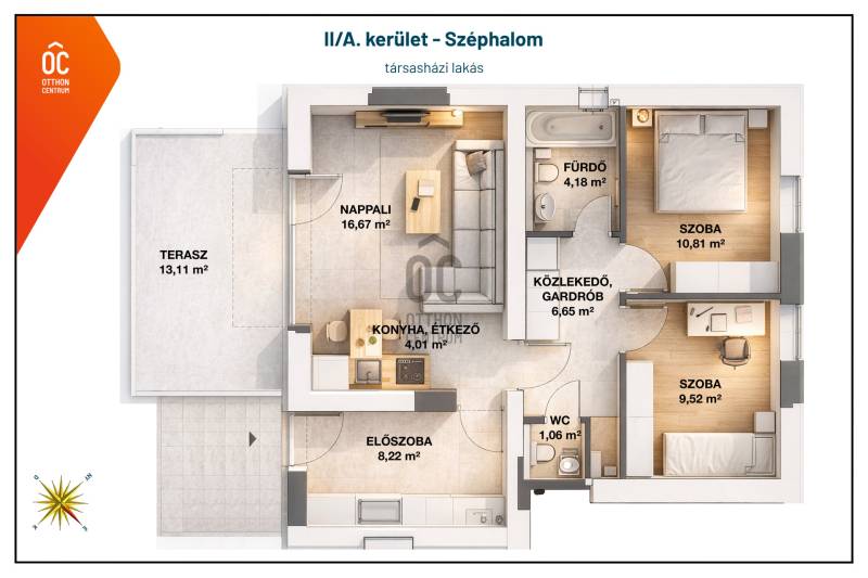 Kiváló adottságokkal rendelkező, nettó 61 m²-es, 3 szobás földszinti, kertkapcsolatos lakást kínálunk eladásra Széphalmon, pár percre Hűvösvölgytől.Ez az ingatlan tökéletes választás mindazoknak, akik a város közelségét keresik, de nem akarnak lemondani a természet nyugalmáról és a saját kert nyújtotta szabadságról.Főbb paraméterek:Alapterület: nettó 61 m² Elosztás: Amerikai konyhás nappali + 2 különnyíló hálószoba, fürdőszoba +wc, gardrób, kézmosós wcFűtés: gázcirkó (radiátoros és padlófűtéses kialakítással)Kültér: 13 m2 terasz + 100 m2 elkülönített saját kertrészÁllapot: Újszerű, modern kivitelezés, prémium anyaghasználatÁtadás: 2026. II. negyedév (kulcsrakész állapotban)Miért érdemes ezt a lakást választania?Modern élettér: praktikus beosztású, amerikai konyhás nappali a családi élet központja, míg a két külön hálószoba privát szférát biztosít a pihenéshez vagy munkához.Zöld környezet: A tágas terasz ideális helyszín reggeli kávézáshoz vagy esti kikapcsolódáshozParkolás: nyitott beálló 1 gépjármű számáraLakások száma: 3Kiváló lokáció: Széphalom a II. kerület egyik legcsendesebb, családbarát része. Kiváló infrastruktúra (Hűvösvölgyi végállomás, Stop Shop, iskolák, óvodák a közelben) és tiszta levegő jellemzi.Kulcsrakész kényelem: Önnek már csak a bútorokat kell hoznia! A lakás a legmodernebb műszaki tartalommal és esztétikus burkolatokkal kerül átadásra.Célcsoport: Kiváló választás fiatal pároknak, egygyermekes családoknak, vagy azoknak a kertvárosi környezetre vágyóknak, akik egy alacsony fenntartású, modern otthont keresnek.Ha szeretné megtekinteni, várom hívását!