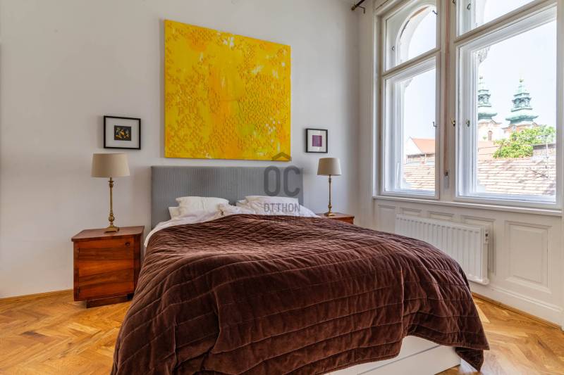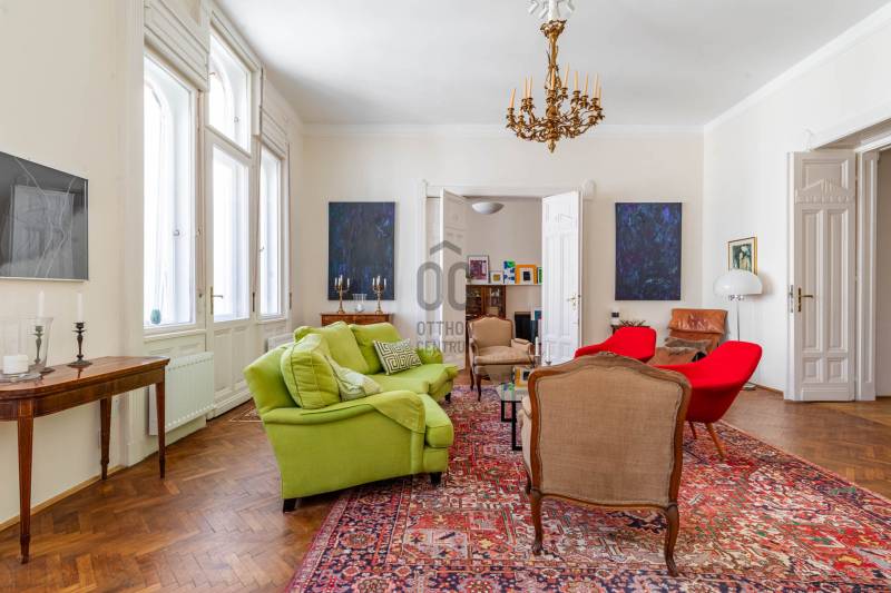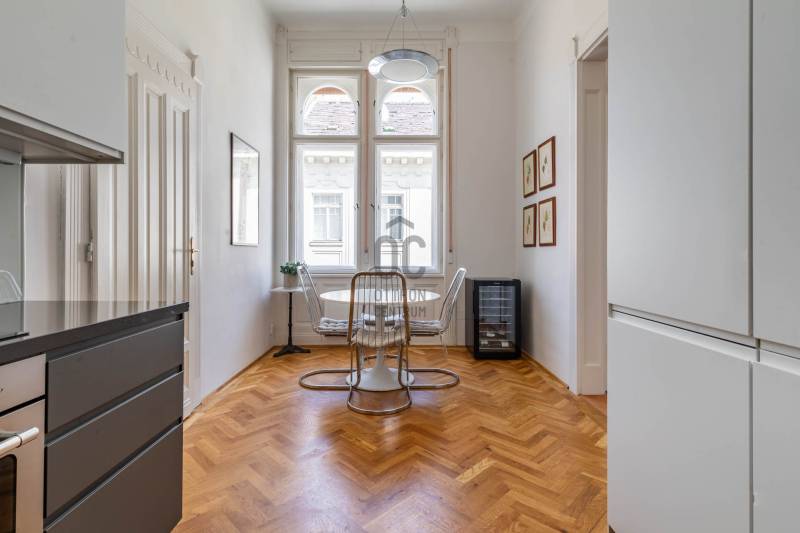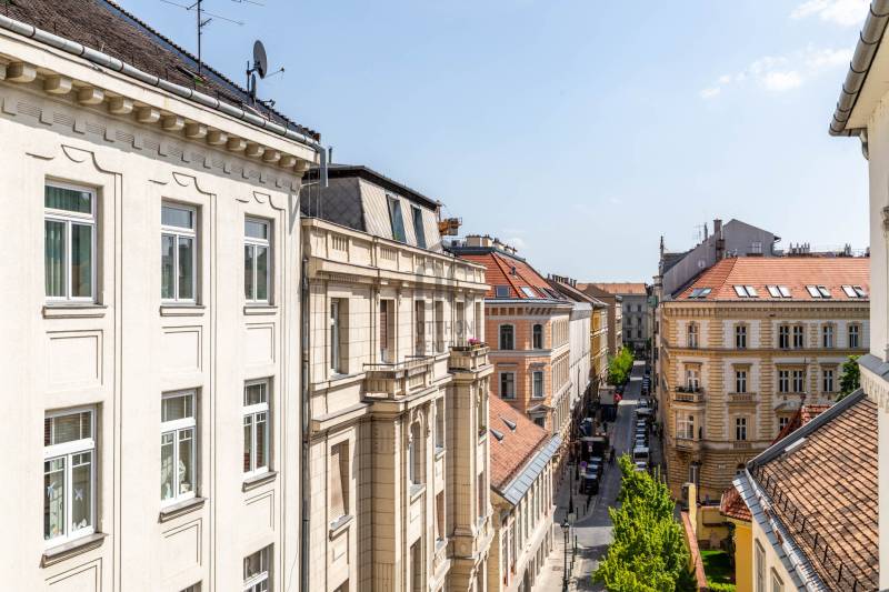 A belvárosban ritkán találni olyan nagypolgári lakást, ami egyszerre őrzi a klasszikus értékeket és valóban élhető, világos tereket kínál. Magas emelet, erkély, hatalmas ablakok és egy időtálló elegancia – ez a lakás pontosan ezt adja. Üdv itthon!RÖVID ÖSSZEFOGLALÓBudapest V. kerületében, a Veres Pálné utcában, a Fővám tér közelében, liftes társasház magas emeletén kiadó egy 113 m²-es + 3,8 m² erkélyes, nappali + 2 hálószobás, külön konyha-étkezős, 2 fürdőszobás, napfényes, klasszikus polgári lakás.Miért pont ez a lakás?- Nagypolgári hangulat: 4,2 m belmagasság, halszálkás parketta, díszes nyílászárók- Közel 36 m²-es nappali, 4 hatalmas ablakkal- Erkélyes – ritkaság ezen a környéken- Kiváló elosztás, akár külön lakrész is kialakítható- Világos, keleti tájolás – reggeli napfény az egész lakásban- Liftes, rendezett házOTTHONA lakás nagy alapterületének és átgondolt elrendezésének köszönhetően kényelmes, jól használható tereket kínál. A funkciók logikusan elkülönülnek, mégis egységes, áramló térérzet jellemzi.Az előszobából egy tágas közlekedő nyílik, amely dolgozóként is jól használható. Ebből érhető el a vendég fürdőszoba, amelynek különlegessége az eredeti, festett ólomüveg, így természetes fényt kap a lépcsőház felől.A nappali a lakás központi tere: közel 36 m² alapterületű, 4,2 méteres belmagassággal. Négy nagyméretű ablak néz a Veres Pálné utcára, keleti tájolásának köszönhetően reggel napfényben úszik. Az erkély a nappaliból nyílik, ahonnan hangulatos belvárosi panoráma tárul elénk: tetők, templom és a Veres Pálné utca karakteres látványa.A nappali két oldalán helyezkednek el a hálószobák, így jól szeparált, mégis egységes térszerkezet alakul ki. A kisebb hálószoba az étkező felől közelíthető meg, és saját fürdőszobával rendelkezik, így önálló egységként is használható. A nagyobb, 21 m²-es hálószoba tágas, jól berendezhető. TÁRSASHÁZA ház liftes, azonban a lift a földszintről néhány lépcsőn keresztül érhető el. A lakás a függőfolyosó elején helyezkedik el, közvetlenül a lépcsőház és a lift közelében.A közös költség 48 000 Ft, amely tartalmazza a szemétszállítást, lift karbantartást, takarítást és a felújítási alapot. Minden egyéb fogyasztás egyedi mérés alapján fizetendő. A fűtés modern, elektromos rendszerrel megoldott: a hidegburkolt helyiségekben padlófűtés, a többi helyiségben radiátoros hőleadás működik.LOKÁCIÓ – DÉL-BELVÁROSEz a környék Budapest egyik legélhetőbb része. Pár perc sétára a Duna-part, a Vásárcsarnok, kiváló éttermek és kávézók találhatók. A Szabadság híd és a Gellért-hegy közelsége miatt a mindennapok része lehet egy esti séta vagy kikapcsolódás.Kiváló közlekedés:- 47–49 villamos- M3, M4 metró, minden pár percen belül elérhetőMilyen feltételekkel bérelhető az ingatlan?- minimum 12 hónap- 2 havi kaució- gyerek és kisállat megengedett- dohányzás kizárólag az erkélyen- azonnali költözésHa egyedi, karakteres otthont keresel, amit nem jön szembe minden sarkon, akkor megtaláltad.Keress bátran és egyeztessünk megtekintési időpontot!----------------------------------------------A hirdetésben szereplő információk tájékoztató jellegűek. A tévedés és az árváltoztatás jogát fenntartjuk. Az esetleges elírásokért és technikai hibákért felelősséget nem vállalunk.