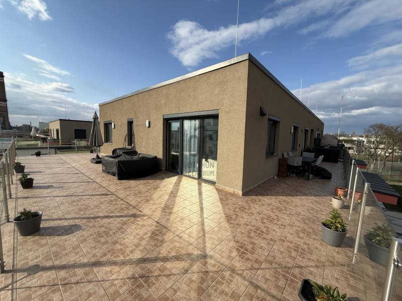 Eladó a Híd-Köz lakóparkban 102 m2, nappali plusz négy hálószobás, duplakomfortos penthouse lakás, a hozzá tartozó 118 m2 TERASSZAL!Az ingatlan tízlakásos társasház második emeletén helyezkedik el. Impozáns terasza U alakban öleli körbe a lakást, amelynek négy különnyíló szobájából,és a nappaliból a nap bármely időpontjában találunk akár napfényes, vagy árnyékos helyet a kellemes időtöltéshez.Hőszivattyús rendszer padló fűtés, mennyezet fűtés-hűtés funkciókkal szolgálja az ott lakók kényelmét.Nagycsaládoknak kitűnő választás! Az épület alatt külön helyrajzi számon nyilvántartott 21 m2 garázs is vásárolható. Ennek ára 14 millió forint.További információért, megtekintéssel kapcsolatos időpont egyeztetésért várom hívását!