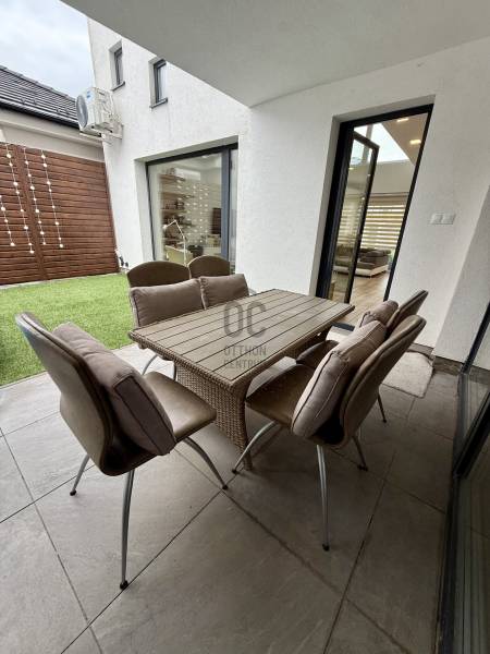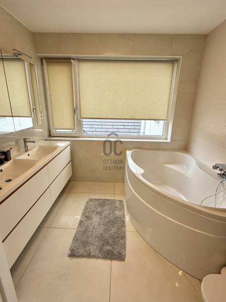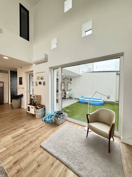 Remek lehetőség családosok számára Üröm csendes, de mégis jól megközelíthető részén!Az átgongolt kialakítású, 2021-ben épült, kétszintes ikerház tágas, nagy belmagasságú amerikai-konyhás nappalija, hatalmas üvegfelületei különleges hangulatú otthont teremtenek.Tökéletes választás lehet minden olyan család számára, akik a kényelmet és a modern életvitel előnyeit keresik. A házban található 2 fürdőszoba, mosókonyha garantálja a kényelmes mindennapokat, míg a tágas nappali és a konyhaszigetes amerikai konyha ideális teret biztosít a közös családi pillanatokhoz. A prémium kivitelezés és a beépített bútorok, szekrények biztosítják, hogy Önnek csak be kelljen költöznie.A ház rezsije nagyon kedvező, melyet a hőszivattyús fűtés , a napelem renszer, a klímák biztosítanak. A hangulatvilágítás valamint a hatalmas üveg felületek pedig a modern otthonok elvárásainak megfelelően varázslatos atmoszférát teremtenek. A nagy belmagasság és a világos terek garantálják, hogy minden szoba napfényben úszik, így az otthon valódi oázissá válik.A különleges beosztású ház nappalija két irányban is kertkapcsolatos, az egyik belső átriumos, intim, és minden időjárásban praktikusan használható mert félig fedett, míg a ház mögött egy terasz kapcsolatos nagyobb kert került kialakításra, ahol még egy kis játszótér is helyet kapott. Automata öntözőrendszer gondoskodik a szép zöld kert fenntartásáról, míg a kerti tároló praktikus megoldást kínál a kinti eszközök és bútorok tárolására. Az elektromos autó töltés lehetősége is adott, így a környezettudatos életmód híveinek is ideális megoldást nyújt.A környék nyugodt, családbarát légkörével, valamint a közeli játszóterek és parkok révén ideális helyszínt biztosít a gyermekek számára a szabadban való játékhoz. A közlekedés szempontjából is kedvező helyzetben található, hiszen a közeli buszmegállók és a könnyen elérhető autóutak révén Budapest belvárosa gyorsan és kényelmesen megközelíthető. Üröm egyre népszerűbb választás a családok körében, hiszen a város zöldövezete és csendes utcái ideális hátteret nyújtanak a mindennapi élethez. Amennyiben felkeltette érdeklődését ez a kivételes ingatlan, kérem hívjon!