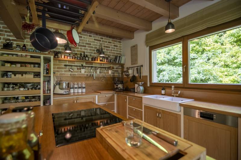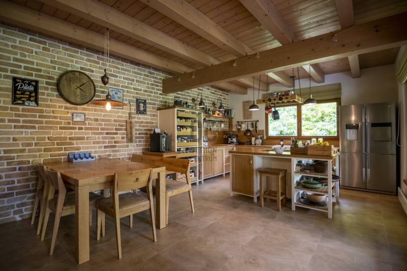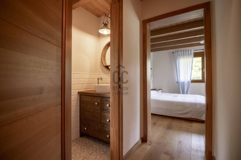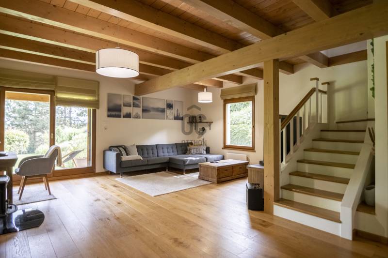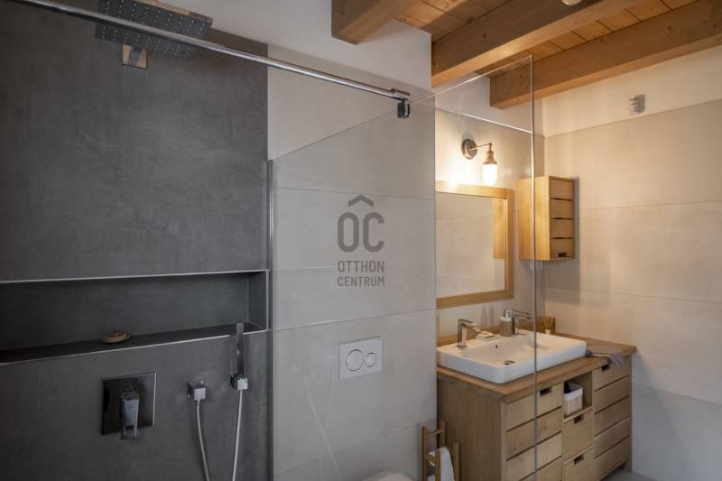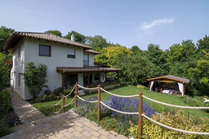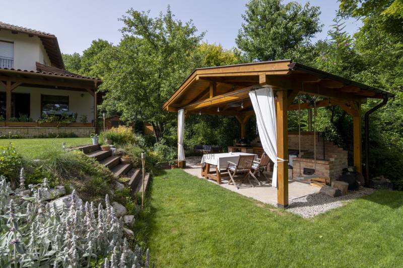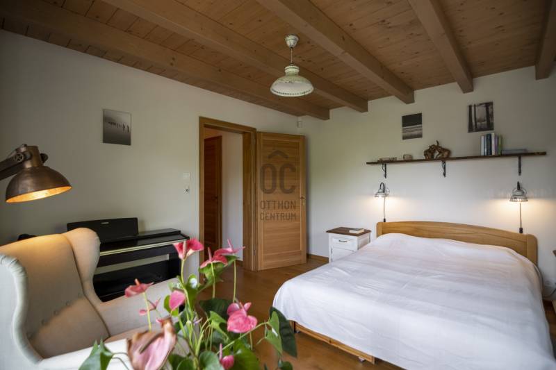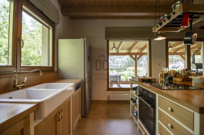Erdőszéli, prémium hangulatú családi ház eladó Nagykovácsiban – intim kerttel, különleges extrákkalNagykovácsi egyik legnyugodtabb, legszebb részén, a Cseresznyés városrész csendes zsákutcájának végén kínálunk megvételre egy 2019-ben épült, 156 nm-es, teraszos családi házat, közvetlen erdőkapcsolattal és gondosan kialakított, intim kerttel, nyárikonyhával.Ez az otthon tökéletes választás azok számára, akik a természet közelségét keresik kompromisszumok nélkül.✨ Főbb jellemzők156 nm lakótérTágas nappali–konyha–étkező egy légtérben3 külön nyíló szoba + gardrób2 fürdőszobaPanorámás franciaerkély kovácsoltvas korláttalHangulatos nyárikonyha, szaletli bográcsozóval és sparhelttelBaltresto thermowood fürdődézsa (fa + elektromos fűtéssel, szűrőrendszerrel)Két külön tárolóAutomata öntözőrendszerMotoros alumínium redőnyök szúnyoghálóvalRiasztórendszer, biztonsági szolgálathoz bekötve???? Műszaki tartalomÉpítés éve: 2019Szerkezet: korszerű favázas könnyűszerkezetKiemelkedő szigetelés: 120 mm EPS + 150 mm ásványgyapot→ nyáron hűvös, télen gyorsan és gazdaságosan fűthetőHáromrétegű fa nyílászárókPrémium burkolatok: tömör tölgy padló és lépcső, fa födém, mészkő teraszFűtés:programozható, online vezérelhető elektromos rendszerJotul öntöttvas kályha a nappalibanpadlófűtés a fürdőszobákban???? Konyha és étkezőEgyedi, tömör tölgy konyhabútorKarakteres bontott tégla falHangulatvilágítás (Olaszországból és Angliából származó lámpákkal)Beépített gépek:AEG sütő és mosogatógép70 cm-es főzőlapBEKO amerikai hűtő???? ElhelyezkedésA telek közvetlenül az erdővel határos, így garantált a nyugalom, a friss levegő és a természet közelsége egész évben.Nagykovácsi zsákfalu jellegének köszönhetően átmenőforgalomtól mentes, ugyanakkor minden fontos infrastruktúra (iskola, óvoda, bevásárlás, orvosi rendelő, gyógyszertár, tömegközlekedés) kb. 15 perc sétával elérhető.❤️ Miért különleges?Ez az ingatlan nem csupán egy ház, hanem egy életstílus: természetközeli, mégis komfortos, átgondolt és igényes. A prémium anyaghasználat, az egyedi részletek és a hangulatos kültéri megoldások valóban ritka kombinációt alkotnak.Ha egy igazán különleges, értékálló otthont keres, ezt a házat érdemes személyesen is megtapasztalnia.